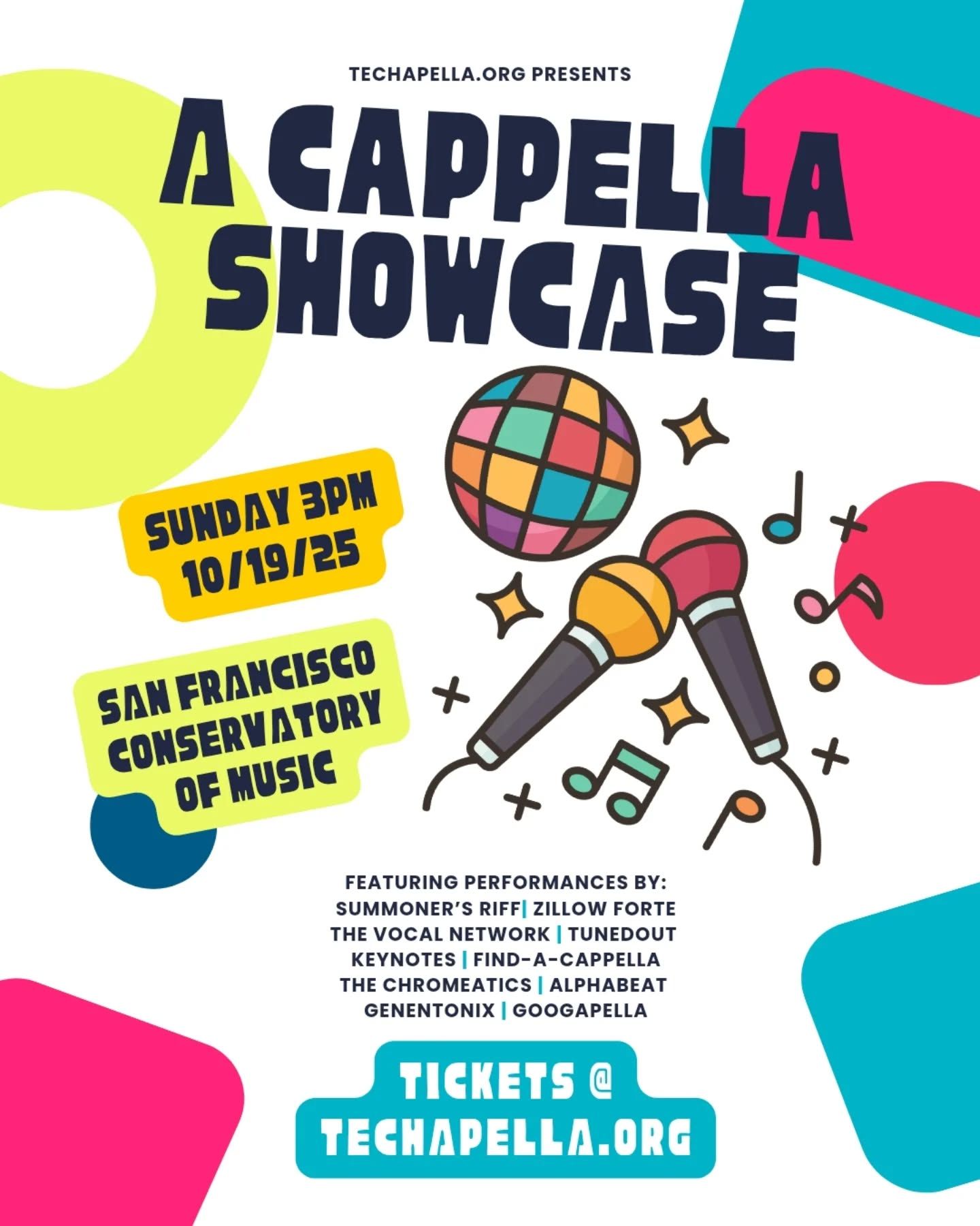 For years Techapella has been known as an a cappella concert series, showcasing the best a cappella the tech industry has to offer. Techapella’s flagship event, the Techapella Showcase, brings together a cappella groups from tech companies all over the Bay Area for a vibrant, non-competitive concert. The showcase celebrates community and collaboration as performers unite to deliver high-energy sets featuring pop hits, jazz, choral ballads, and nostalgic throwbacks.
