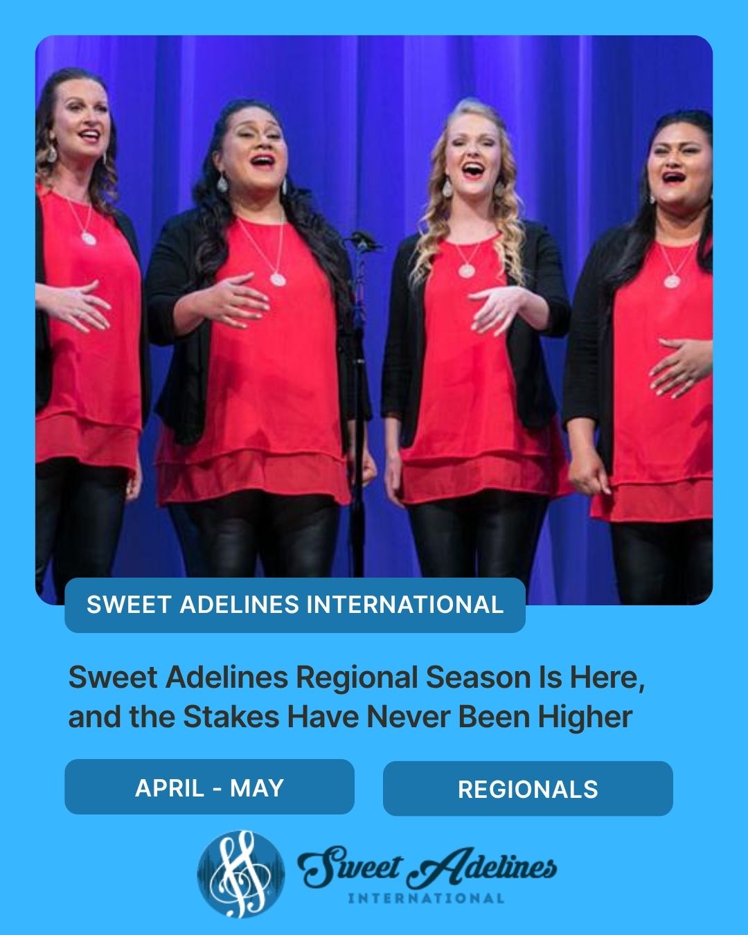 Every regional contest this spring is a qualifying event. The road to Columbus runs through all of them. Full details, orders of appearance, and webcast information for each region are available at sweetadelines.com.